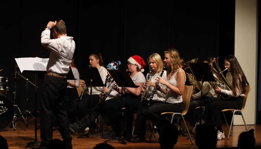 Während also die 5. Klassen und die Bläserklasse 6 den ersten Teil des Konzerts gestalteten und zeigten, was sie im Unterricht erarbeitet hatten, war der zweite Teil nach der Pause den Teilnehmenden gewidmet, die sich außerhalb des Unterrichts der Musik widmen: dem Eltern/Lehrer-Chor, aber auch der Small- Band sowie der Big – Band. Sie alle überzeugten mit viel musikalischer Leidenschaft und boten Klassiker wie last Christmas, das zu Weihnachten natürlich nicht fehlen durfte, oder auch Hallelujah, das sich ganz zart entfaltete, betraten aber auch musikalisches Neuland, beispielsweise mit dem Snowman.